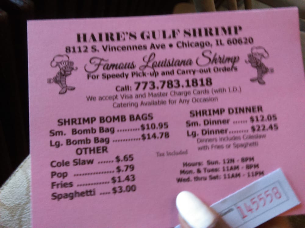 Haire's Gulf Shrimp, located in Chicago, is a seafood spot that has gained popularity for its delicious fried shrimp. With a Louisiana-inspired menu, this place offers both bagged shrimp options and dinner servings, accompanied by sides like coleslaw, fries, or even spaghetti with ground beef. The shrimp here are fresh, perfectly breaded, and made to order, making them stand out from the rest. Customers rave about the fast service, friendly staff, and the overall casual dining experience. Although parking might be a bit tricky, the quality of the food makes up for it. If you're a shrimp lover looking for a satisfying and quick meal, Haire's Gulf Shrimp is the place to go. Enjoy the crispy shrimp, creamy coleslaw, and unique sides in a convenient take-out setting.